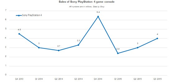 Продажа четырёх миллионов консолей Sony PlayStation 4 в третьем квартале календарного года заставила Sony пересмотреть прогноз по поставкам PS4 в этом финансовом году в сторону повышения. Согласно текущим ожиданиям, компания намеревается продать 17,5 млн приставок PlayStation 4 в текущем финансовом году, который заканчивается 31 марта 2016. Если прогнозы компании сбудутся, то к концу первого квартала 2016 глобальные продажи PS4 составят 39,8 млн единиц. Учитывая, что предсказания Sony довольно консервативны, существует большая вероятность, что общие поставки PlayStation 4 к тому моменту значительно превзойдут 40 млн единиц при условии, что компания сможет удовлетворить спрос.