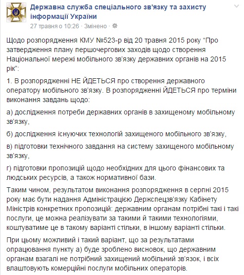 20 мая Кабмин своим распоряжением утвердил план первоочередных мероприятий по созданию Национальной сети мобильной связи государственных органов (Нацсети мобсвязи) на 2015 год. Исполнителем плана определено Администрацию Госспецсвязи. Ранее Кабмин утвердил структуру Национальной системы конфиденциальной связи (НСКС) и условия ее использования для обеспечения безопасности обмена информацией.