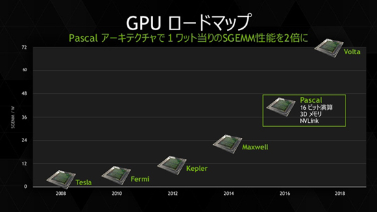 Изначально планировалось, что решения Volta придут на смену нынешним изделиям Maxwell в 2016-м. Однако затем в NVIDIA сообщили, что вместо этого в следующем году свет увидит архитектура Pascal. Ускорители на её основе смогут использовать до 32 Гбайт памяти. При этом сами чипы памяти получат 3D-компоновку. Другим ключевым нововведением в Pascal станет поддержка шины NVLink, которая позволит принципиально ускорить обмен данными между центральным и графическим процессорами или между несколькими графическими чипами в системе.