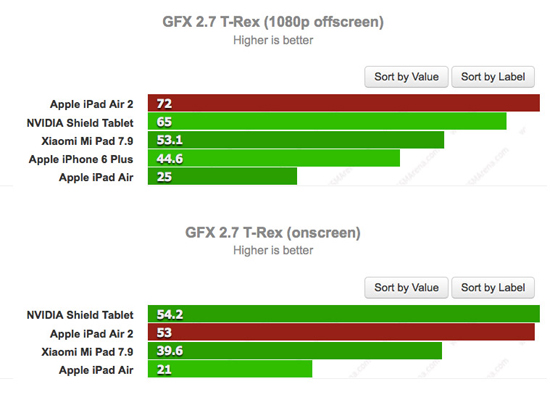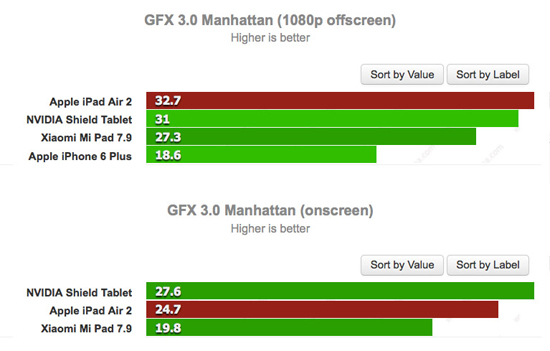 Судя по всему в планшете iPad Air 2 установлен очень мощный графический процессор. Результаты тестирования гаджета в бенчмарках GFXBench 2.7 T-Rex и 3.0 Manhattan показали, что в некоторых случаях графический процессор iPad Air 2 обходит даже графику планшета Nvidia Shield Tablet, в котором установлен чипсет Tegra K1. Последний с полноценным GPU архитектуры Kepler претендует на производительность, достойную консолей Xbox 360 и PS3.