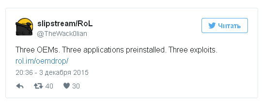 Исследователь в области информационной безопасности, известный под псевдонимом slipstream/RoL, обнаружил, что компьютеры и планшеты компаний Dell, Toshiba и Lenovo небезопасны. Отыскав уязвимости в ПО всех трех производителей, хакер обнародовал в отрытом доступе экслплоиты. Так как slipstream/RoL не потрудился поставить компании в известность о своих находках, под угрозой оказались миллионы пользователей.