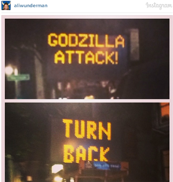 Какой-то шутник в Сан-Франциско решил разыграть водителей, взломав электронный дорожный знак, где вместо обычной информации о пробках разместил сообщение о легендарном японском монстре, 29-й фильм о котором на днях вышел в прокат.