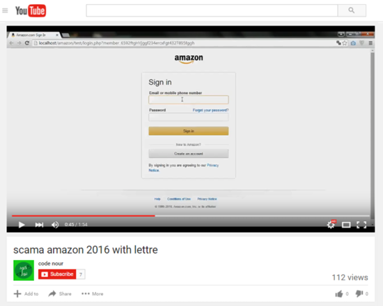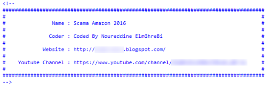 При первом рассмотрении фишинговый ресурс, имитирующий сайт Amazon.com, не особенно заинтересовал экспертов компании – такого «добра» в сети много. Однако более детальное изучение сайта удивило специалистов. В исходниках ресурса обнаружилось имя хакера, название фишинговой кампании (Scama Amazon 2016), а также ссылка на его сайт и канал на YouTube (Code nour).