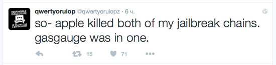 «Так, Apple убила обе моих джейлбрейк-цепочки. GasGauge была одной из них», – написал он. Разработчик отметил, что уязвимость достаточно сложная и была найдена за 2-3 дня. «Я очень горжусь ей», – сказал хакер.