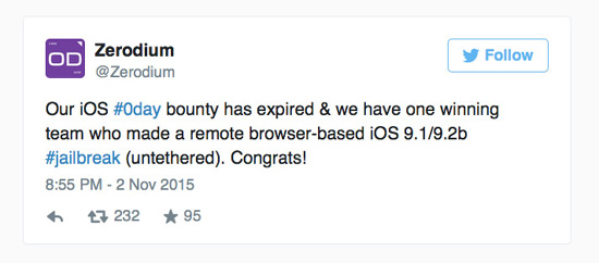 Компания Zerodium, которая занимается скупкой эксплоитов и информации о «дырах» в программном обеспечении, щедро вознаградила группу хакеров, которой удалось создать джейлбрейк для iOS 9. Более того, сообщение в твиттере свидетельствует, что фирма получила в распоряжение эксплоит для взлома новейших iOS 9.1 и iOS 9.2 beta на основе браузера. Хакерам, создавшим эксклюзивный, непривязанный джейлбрейк для «девятки», выплатили миллион долларов.