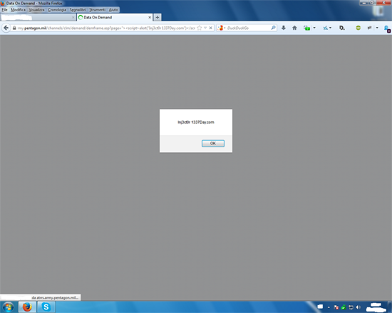 Согласно сообщению участников хакерской группировки Inj3ct0r в социальной сети Facebook, им удалось обнаружить XSS-уязвимость на официальном web-сайте Пентагона. В качестве подтверждения своим словам злоумышленники опубликовали снимок экрана, на котором продемонстрирован результат эксплуатации бреши.