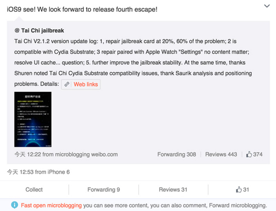 Apple всегда выступала против джейлбрейка, ведь получение корневого доступа дает пользователям возможность устанавливать не только легальный софт из App Store, но и, к примеру, пиратские приложения из непроверенных источников. Тем не менее, находятся разработчики, которых не устраивает такое положение дел. В комментариях к одному из сообщений в китайском аналоге Twitter хакер из TaiG написал: