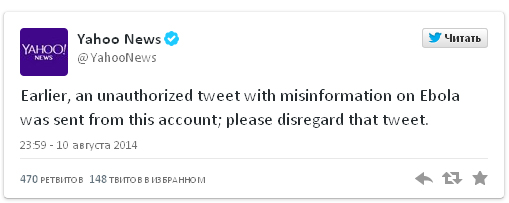 Через некоторое время сообщение было удалено. «Ранее с этого аккаунта был отправлен неавторизованный твит с ошибочной информацией о лихорадке Эбола. Пожалуйста, не обращайте внимание на указанный твит», – заявили в Yahoo News.