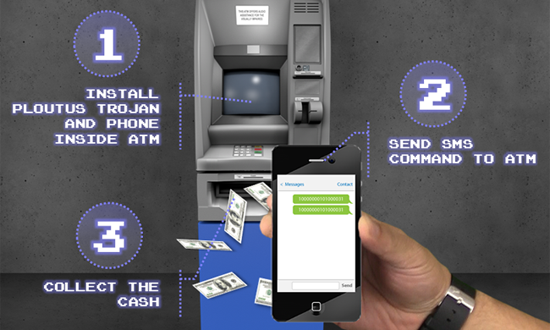 Для этого, правда, злоумышленникам надо проделать достаточно опасную для них работу. На банкомат необходимо установить вредоносное ПО Ploutus, затем к устройству с помощью кабеля надо подсоединить телефон и отослать на него два определенных SMS. Текстовые сообщения трансформируются в сетевой пакет, который заставляет банкомат выдавать наличные.