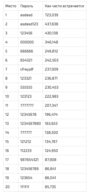 На основе утечки специалисты LeakedSource составили топ самых популярных запросов. Кроме странного «cfreyjdf» на 7-м месте, стоит отметить, что в топе не оказалось «qwerty» и вариаций на тему «пароль», а «111111» оказался только на 20-м месте.