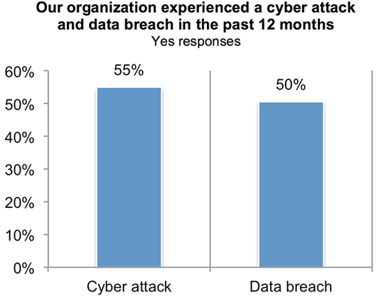 Согласно результатам исследования, 50% респондентов сознались, что их компания допустила утечку данных. 55% респондентов подверглись хакерской атаке, и только 14% заявили о наличии эффективной защиты от кабератак.