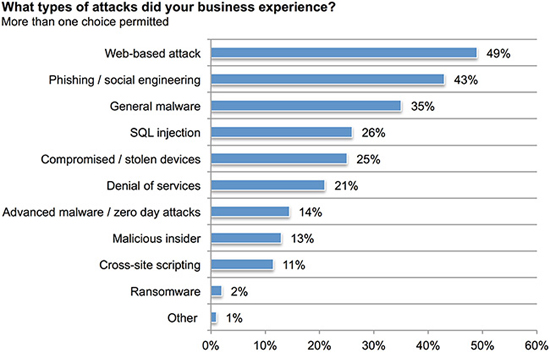 Среди самых распространенных видов атак исследователи называют атаки на web-приложения (49%), атаки с использованием социальной инженерии и фишинга (43%), вредоносное ПО (35%).
