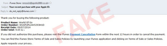 Схема мошенников довольно незатейлива. Сперва на почтовый ящик пользователя приходит сообщение о якобы совершенной покупке игры «World Of Go», по цене 9,65 евро. В письме также находится уведомление о том, что отменить покупку можно, в течение 12 часов после ее совершения, на сайте App Store, для чего следует перейти по ссылке «Payment Cancellation», содержащейся в тексте сообщения. Перейдя по ссылке, пользователь оказывается на фальшивом сайте интернет-магазина, где и происходит процесс хищения ключей.