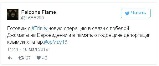 В конце текста от имени Аксенова говорится, что он очень рад победе Джамалы на Евровидении и рассчитывает на успешное проведение конкурса в 2017 году "в Украине, а именно - в Крыму". Обращение завершается хэштегом #OpMay18, характерным для альянса Falcons Flame и Trinity.