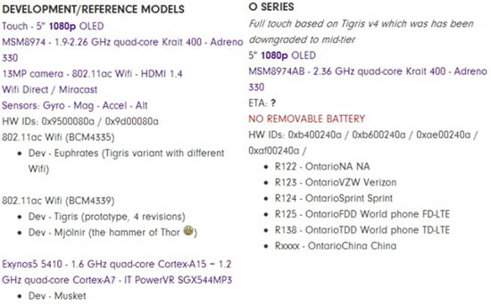 Открывают утечку референс-модели и модели для разработчиков. Это девайсы с кодовыми именами Euphrates, Tigris, Mjolnir и Musket. Все они получили 5" OLED-экран с разрешением 1080p, 13-Мп камеру и неплохой набор модулей. Musket основан на процессоре Exynos Octa 5410 (4 ядра по 1,6 ГГц и 4 ядра по 1,2 ГГц, графика PowerVR SGX544MP3), остальные работают на Qualcomm Snapdragon MSM8974 (4 ядра с частотой от 1,9 ГГц до 2,26 ГГц, графика Adreno 330). На модели Tigris основан будущий флагман компании - Ontario. Среди его характеристик упоминается Snapdragon MSM8974AB с частотой 2,36 ГГц и несъёмный аккумулятор.
