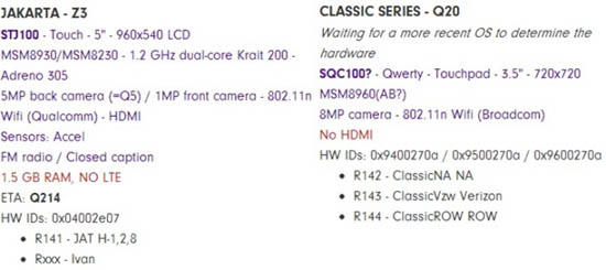 Jakarta Z3 и Classic Q20 уже анонсированы официально, однако их характеристики были неизвестны. Z3 получил 5" экран с разрешением 960х540, двухъядерный процессор с частотой 1,2 ГГц, 5-Мп и 1-Мп камеры, радио, 1,5 ГБ оперативной памяти, но не получил LTE. Q20 оснащён QWERTY-клавиатурой с тачпадом, 3,5" экраном с разрешением 720х720, 8-Мп камерой, процессором Qualcomm Snapdragon MSM8960.