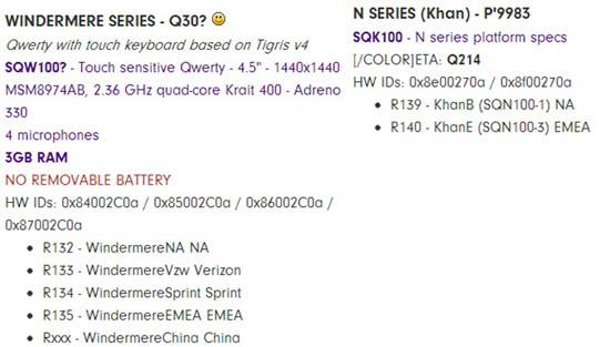 Всё чаще фигурирующий в утечках Windermere, как и Ontario, основан на Tigris. Это QWERTY-фон с 4,5" экраном разрешением 1440х1440, процессором Qualcomm Snapdragon 800 с частотой 2,36 ГГц, 4 микрофонами, 3 ГБ оперативной памяти и несъёмным аккумулятором. Главной особенностью смартфона станет клавиатура, которая будет и сенсорной, и физической. Сюрпризом стал P'9983 Khan, который продолжит линейку Porsche Design.