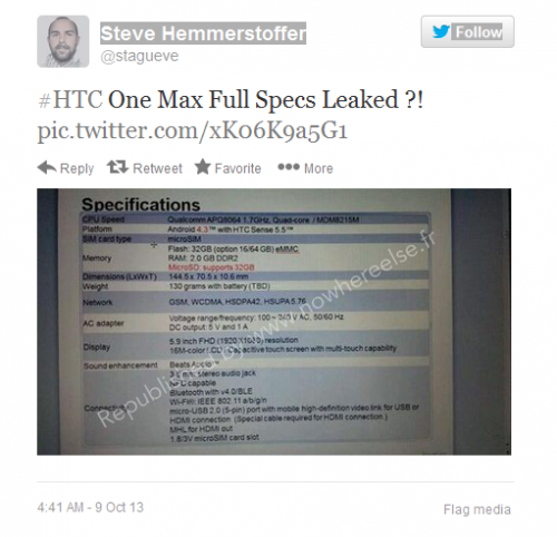 Редактор французского блога Nowhereelse.fr Стив Хеммерстоффер опубликовал спецификации HTC One Max в своем твиттере. На картинке указаны Android 4.3, Sense 5.5 (а это значит - отключаемый Blinkfeed), экран с диагональю 5.9 дюймов и разрешением 1080х1920 (FHD), четырехъядерный Qualcomm Snapdragon 600 с частотой 1.7 ГГц, 2 ГБ оперативной памяти, 32 ГБ памяти для хранения данных, слот для microSD-карт и батарея емкостью 3200 мА/ч.