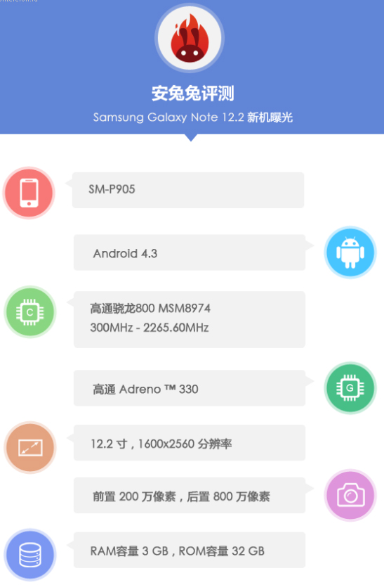 Планшет Samsung Galaxy Note 12.2 уже несколько раз всплывал в Сети, но о характеристиках устройства мы почти ничего не знали. Сегодня девайс засветился в базе данных AnTuTu, благодаря чему можно представить, чего следует ожидать от будущей новинки.