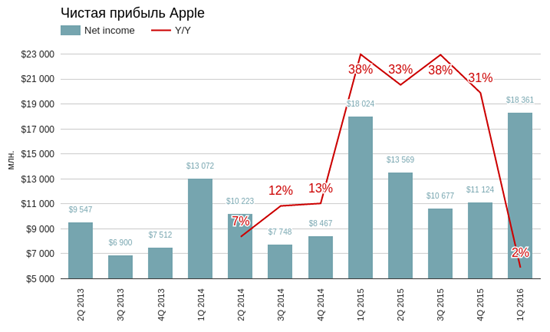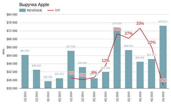 Выручка компании в отчетном периоде составила $75,872 млрд (+2% г/г). С одной стороны, это рекорд для Apple, с другой — показатель продемонстрировал самый низкий темп роста год к году за всю ее историю. Стоит добавить, что консенсус аналитиков Bloomberg предполагал выручку на $720 млн больше. По словам главы компании Тима Кука, достигнуть этой цели помешало негативное влияние дорогого доллара и замедление экономики в развивающихся странах.