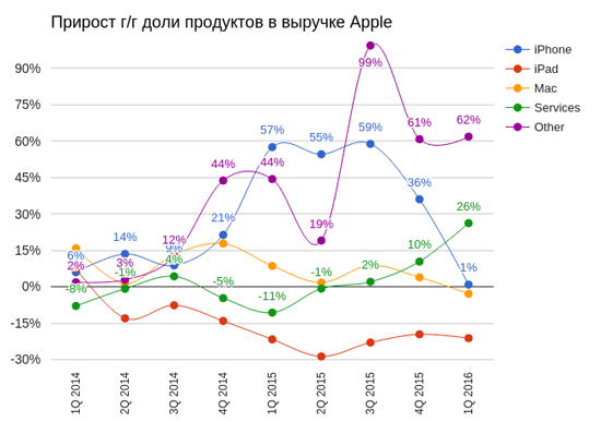 Теперь в структуре выручки компании роль ключевого драйвера роста принадлежит услугам (Services) и прочим доходам (Other). Однако беда в том, что суммарная доля этих элементов обеспечивает лишь 14% доходов компании. Кстати, в состав элемента Other входит выручка от реализации Apple Watch. Однако детальные цифры по продажам этого гаджета в последней отчетности не освещались.