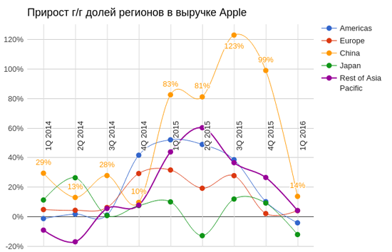Китай, ключевой рынок Apple, и на этот раз подвел. Объемы реализации в Поднебесной увеличились лишь на 14%, при среднем прошлогоднем квартальном показателе 100%. Тим Кук по-прежнему оптимистично относится к перспективам Китая и не собирается менять планы по расширению местной сети фирменных магазинов. Однако даже он признал определенные признаки насыщения рынка в данном регионе. Интересно отметить, что рост продаж iPhone в Индии составил 76%, однако, сколько это в абсолютных показателях, компания не сообщила.