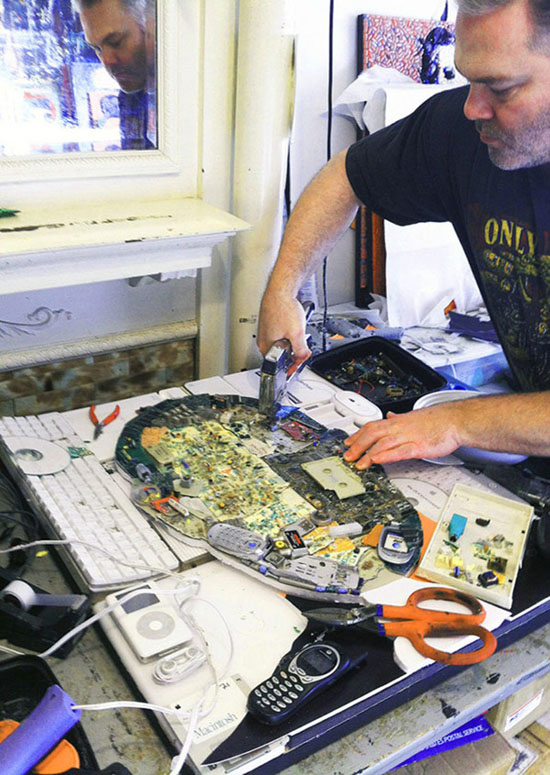 Джейсон Мерсье решил увековечить в присущей ему манере образ Стив Джобса. Для создания необычного портрета художник выбирал старую электронную технику: мобильные телефоны, CD-диски, кабели, провода, вилки, клавиатуры, дискеты, компьютерные мыши, флешки, аккумуляторы, фотоаппараты, карты памяти, батарейки, детали плат. Оказывается, даже легендарного предпринимателя можно собрать из такого вот сора.