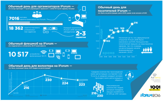 По данным стартапа Adtena (онлайн-платформы по работе с публичными Wi-Fi сетями), 7016 человек, которые пришли на форум, использовали порядка 18 362 устройств. Это значит, что каждый посетитель пользовался 2-3 гаджетами для подключения в Интернет (больше данных см. в инфографике от 1991 Инкубатор).