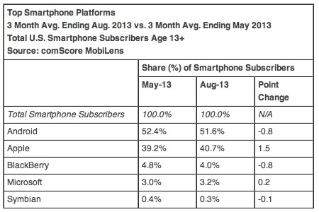 Согласно докладу компании ComScore, в последние три месяца операционной системе iOS удалось отвоевать около 1,5% рынка и практически догнать своего основного конкурента Android, который потерял 0,8%.