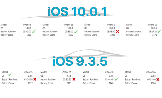Сравнение энергоэффективности операционных систем проводилось при помощи бенчмарка, входящего в пакет Geekbench. В тесте участвовали iPhone 6s, iPhone 6, iPhone 5s и iPhone 5. Смартфоны под контролем iOS 10.0.1 и iOS 9.3.5 зарядили до 100% и запустили тест до полной разрядки устройств.