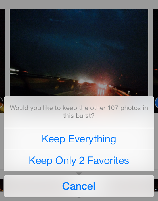 До iOS 7.0.2 в iPhone 5s присутствовала возможность лишь выбирать лучшие фотографии, но вся серия снимков сохранялась на устройстве. Теперь же при использовании «Серии», а для этого достаточно зажать кнопку фотосъемки, пользователям будет предоставлен выбор удалить все изображения и оставить лишь избранные или же возможность сохранить все фотографии.