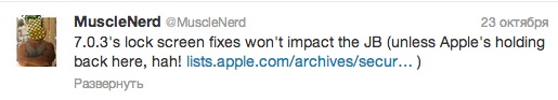 Хакер MuscleNerd, который поначалу предостерегал пользователей от установки 7.0.3, внимательно изучил обновление и сделал вывод, что никакой угрозы для джейлбрейка оно не представляет. В своем «Твиттере» он написал: «Исправление ошибки с экраном блокировки в 7.0.3 никак не отразится на джейлбрейке (если, конечно, Apple ничего здесь не утаивает)». В твите он также разместил ссылку на страницу с перечнем обновлений, которые получила новая версия прошивки.