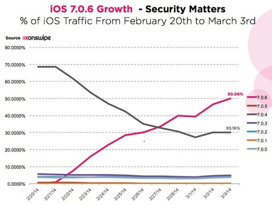 Об этом свидетельствуют данные компании Onswipe, предоставляющей услуги мобильной платформы для публикаций и монетизации. Анализ трафика Onswipe показывает, что по состоянию на 3 марта доля iOS 7.0.6 составляет 50,06% от трафика устройств под управлением всех версий iOS.