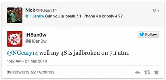 Известный хакер iH8sn0w наглядно продемонстрировал отсутствие каких-либо подобных ограничений на это. На один из вопросов в «Твиттере» он ответил, что его iPhone 4S успешно взломан и работает под управлением iOS 7.1, в то время как общедоступного джейлбрейка для него нет.