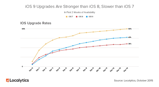 По версии Localytics, за две недели iOS 9 была установлена на 46,6% девайсов Apple, поддерживающих апгрейд. iOS 8 в прошлом году за это же время охватила 36% устройств, а iOS 7 – 60%. Localytics связывает это с тем, что из данной троицы семерка была более интересной для рядового пользователя за счет визуальных изменений.