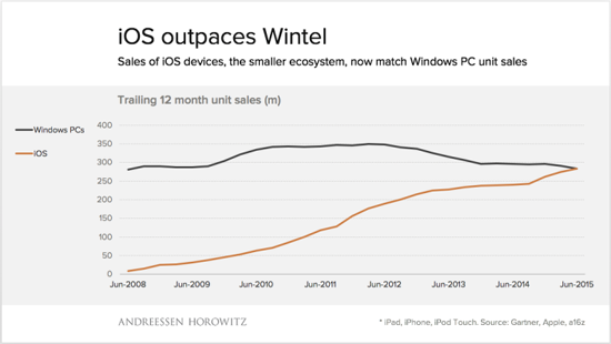 На этой неделе Apple опубликовала финансовые отчёты за третий квартал 2015 года, согласно которым за минувшие 3 месяца купертиновская компания сумела реализовать 47 миллионов iPhone и 10,9 миллиона iPad, заработав при этом $10,7 миллиарда. В этой статистике не учитываются плееры iPod touch, которые также работают на iOS, однако, как заметил Бенедикт Эванс из агентства a16z, продажи мобильных устройств под управлением "яблочной" операционной системы впервые превзошли компьютеры на Windows, которые на протяжении последних нескольких лет демонстрируют медленное, но уверенное снижение продаж.