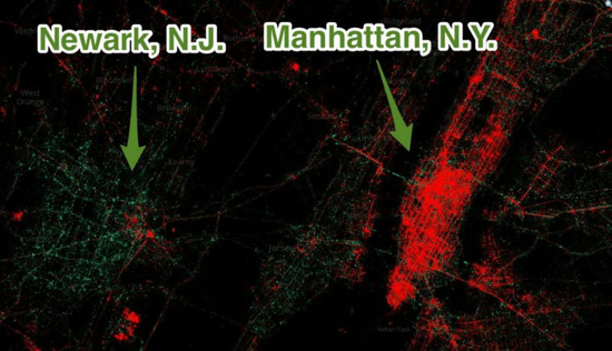 Business Insider приводит пример из США. К примеру, в Манхэттене (центр Нью-Йорка), где проживают богатые люди (средний доход 67 000 долларов в год), сплошные iOS-девайсы. Тогда как в Ньюарке (крупнейший город штата Нью-Джерси), где средняя зарплата 17 000 долларов в год, мы видим гораздо больше Android.