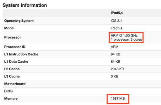 Преследуемая цель – не подсчет абстрактных баллов производительности, а анализ работы системы для того, чтобы понять ее конфигурацию и параметры отдельных узлов. В данном случае использовался бенчмарк Geekbench 3, а результаты теста прокомментировал Джон Пул (John Poole), один из основателей студии Primate Labs. Похоже, что в iPad Air 2 установлено 2 Гб оперативной памяти и необычный процессор с тремя ядрами, работающими на частоте 1,5 ГГц.