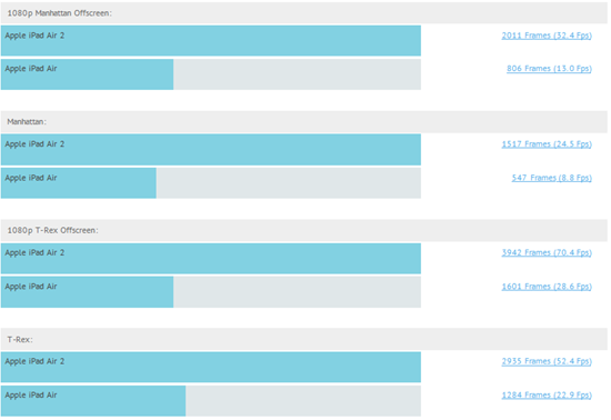 Если о процессорной части второго iPad Air достоверно известно об использовании трехъядерного процессора, то официальных данных о GPU не появлялось. Предполагается, что это PowerVR GX6650 в максимальной конфигурации с шестью активными кластерами. Впрочем, обычных пользователей больше интересует итоговая производительность. Оценить быстродействие моделей можно по бенчмаркам GFXBench 3.0: