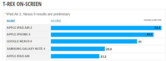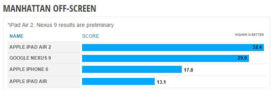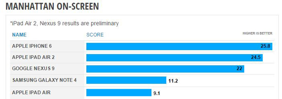 Единственный конкурент iPad Air 2 в этих тестах — смартфон iPhone 6, который выигрывает в onscreen-тесте благодаря меньшему разрешению экрана (2048 х 1536 пикселей против 1334×750 пикселей).