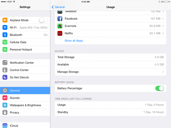 При тестировании iPad Air в режиме LTE-точки доступа новый планшет продержался 24,08 часов при скорости доступа в 100 Кбайт/с. Стоит отметить, что iPad 3 проходил аналогичный тест при скорости 50 Кбайт/с.