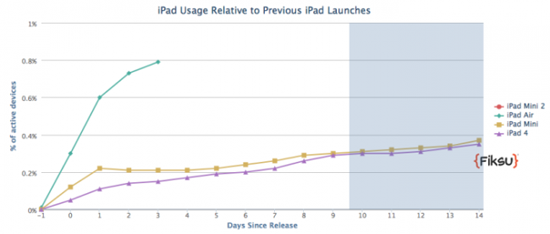Но это еще не все. Аналитическая компания Fiksu опубликовала свои данные по популярности iPad Air, где сообщает о четырехкратном росте пользования приложениями с новых iPad по отношению к запускам предыдущих поколений планшета. Правда, их исследования верны только для тех программ, которые поддерживают статистику Fiksu.