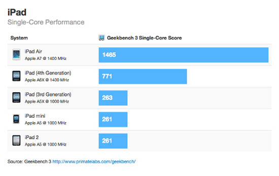 Опубликованы первые результаты тестов на производительность планшета iPad Air, представленного компанией Apple на прошлой неделе. Согласно данным, полученным с помощью бенчмарка Geekbench, новый iPad оказался почти в два раза производительнее своего предшественника, iPad 4-го поколения.