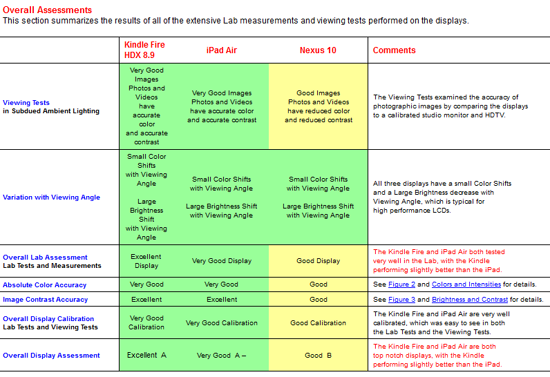 В итоге экран Amazon Kindle Fire HDX 8.9 получил оценку "А" (отлично), экран iPad Air - "A-" (очень хорошо), а экран Nexus - "B" (хорошо).