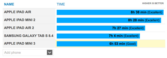 Согласно тестированию PhoneArena, третье поколение iPad mini показало полуторачасовое отставание по времени автономной работы от iPad mini 2. Такой результат удивляет, если вспомнить, что Apple на странице спецификаций указывает одинаковое время автономной работы для iPad mini 3 и iPad mini 2.