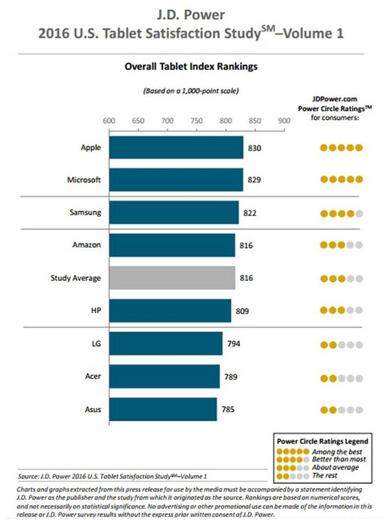Пользователи дали продукту Apple оценку в 830 баллов, что позволило компании занять первое место в рейтинге. iPad оказался лидером по пяти факторам, включая простоту и удобство использования, а также производительность, привлекательность и функционал. На втором месте в рейтинге находятся планшеты Microsoft, набравшие 829 балла. Samsung оказалась на третьей строчке с 822 баллами, следом за которой расположилась Amazon – 816 баллов. В списке J.D. Power and Associates планшет Apple уступил конкурентам лишь в том, что касается цены.