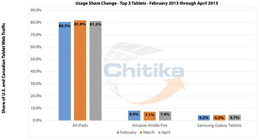Chitika проанализировала более 250000 сайтов и выяснила, что доля iPad в посещениях составляет порядка 80%, что в 10 раз больше, чем у Amazon Kindle Fire и в 17 раз больше, чем у Samsung Galaxy. Стоит учитывать, что 5 месяцев назад доля Apple была на уровне 92%. У Samsung динамика более положительная: ее доля за этот период выросла в два раза: с 2,1% до 4,3%.