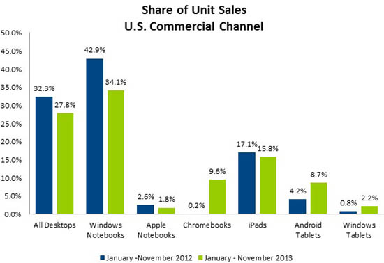 Между тем, продажи Chromebook в США на 2013 год резко возросли до 9,6%, превысив показатели доли ноутбуков от Apple, равные 1,8%. Аналоги на базе Windows продолжают занимать лидирующую позицию, но доля рынка заметно снизилась (с прошлогодних 42,9% до сегодняшних 34,1%).