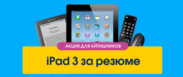 iPad 3 за своё резюме — такая акция началась на Work.ua. Не секрет, что рынок IT-специалистов в Украине, как и во всем мире, испытывает кадровый голод. Компании буквально сражаются друг с другом за каждого сотрудника этой сферы. Теперь борьба за привлечение IT-специалистов переходит и к сайтам по трудоустройству.