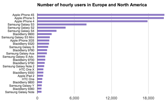 Силами зарубежного ресурса CNET был детально разобран доклад из Actix о времени использования смартфонов разных моделей в Европе и Северной Америке за 2013 год. Тройку самых используемых смартфонов в ушедшем году занимают iPhone разных поколений. Больше всего пользователи мучают iPhone 4s. В среднем в час смартфоном, показавшем нам Siri, пользуются 20 608 человек. iPhone 5 не сильно отстал по популярности, им пользуются 20 529 человек в час. И замыкает тройку iPhone 4 с 17 880 пользователями. Мы не видим в графике iPhone 5s и iPhone 5c. Обе модели вышли в конце года и на статистику повлиять не успели. И лишь уступив пьедестал лучшей тройке от Apple, следом идут смартфоны на Android марки Samsung. Galaxy S 3 стал самым используемым смартфоном от Google, а за ним идут Galaxy S 2 и новинка 2013 года – Galaxy S 4.